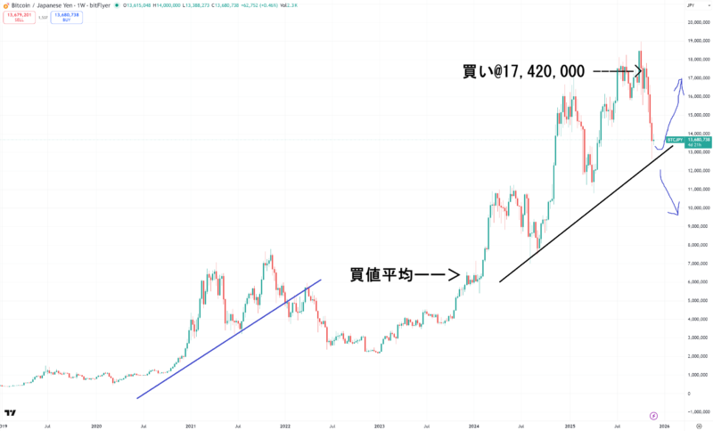 BTCJPY 買い 平均約17,420,000円 (全体平均約6,500,000円) 現在値約13,500,000円